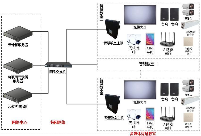 多媒體智慧教室系統(tǒng)配置方案分為三部分:網(wǎng)絡(luò)中心、新建多媒體智慧教室配置、云教室升級為智慧教室配置。