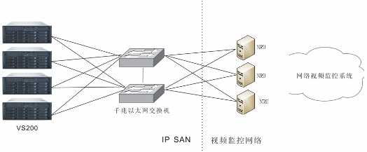 對于監(jiān)控存儲來講,當用戶的應(yīng)用和數(shù)據(jù)量到達一定的水平,就必須考慮將分散在各種平臺上的數(shù)據(jù)整合(consolidate)到一個統(tǒng)一的平臺,進行統(tǒng)一管理。一方面提升數(shù)據(jù)和設(shè)備的使用效率,一方面大大降低維護和管理成本。IP SAN是基于高速以太網(wǎng)的SAN架構(gòu),通過iSCSI(Internet SCSI,Internet小型計算機系統(tǒng)接口)協(xié)議來實現(xiàn)存儲數(shù)據(jù)在服務(wù)器和存儲設(shè)備之間高速傳輸。它繼承了IP網(wǎng)絡(luò)開放、高性能、高可靠性、易管理、可擴展性強、自適應(yīng)性強的優(yōu)點,實現(xiàn)存儲網(wǎng)絡(luò)與應(yīng)用網(wǎng)絡(luò)的無縫連接,并提供了優(yōu)良的遠程數(shù)據(jù)復(fù)制和容災(zāi)特性。