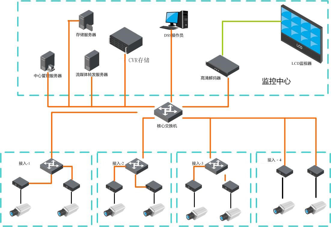 視頻網(wǎng)匯聚層配置中性能交換機(jī),設(shè)置1臺(tái)匯聚交換機(jī),上行通過萬兆光纖雙鏈路上連至核心交換機(jī),從而形成雙鏈路備份。