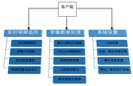 (3)客戶端實現(xiàn)實時監(jiān)控、認證訪問監(jiān)控所有現(xiàn)場設(shè)備,可以實現(xiàn)輪循預覽、電子地圖等功能。