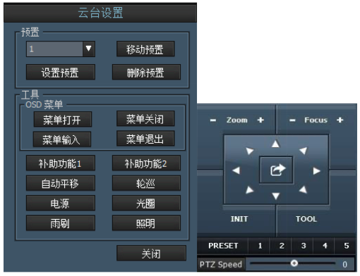 直接在視頻圖像上對攝像機的云臺、一體化球機等設(shè)備實現(xiàn)遠程控制:鏡頭變倍、調(diào)焦、云臺轉(zhuǎn)動(上下左右、定位預置點、巡航、調(diào)節(jié)速度、步進控制)等,操作方便,直觀。