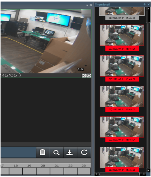 縮略窗口(在一個搜索窗口里):縮略圖能有效地看到每一秒(每一秒的第一幀)的圖像。它能還原第分鐘被丟掉的圖像。當你選擇其它攝像機時,它一樣能恢復。如果你點擊一個縮略圖時,它會顯示暫停。如果你想選擇你前一個時間點,雙擊縮略圖。一定時間間隔的縮略圖功能使得可以細分時間以識別事件發(fā)生時的確切時刻,對龐大存檔中的視頻進行搜索可以在幾秒鐘內(nèi)完成,可以讓用戶自行設(shè)置不同的時間段(如按1小時、幾分鐘,甚至幾秒鐘)來對錄像資料進行搜索,大大減輕了工作人員的操作難度,提高工作人員的管理效率。