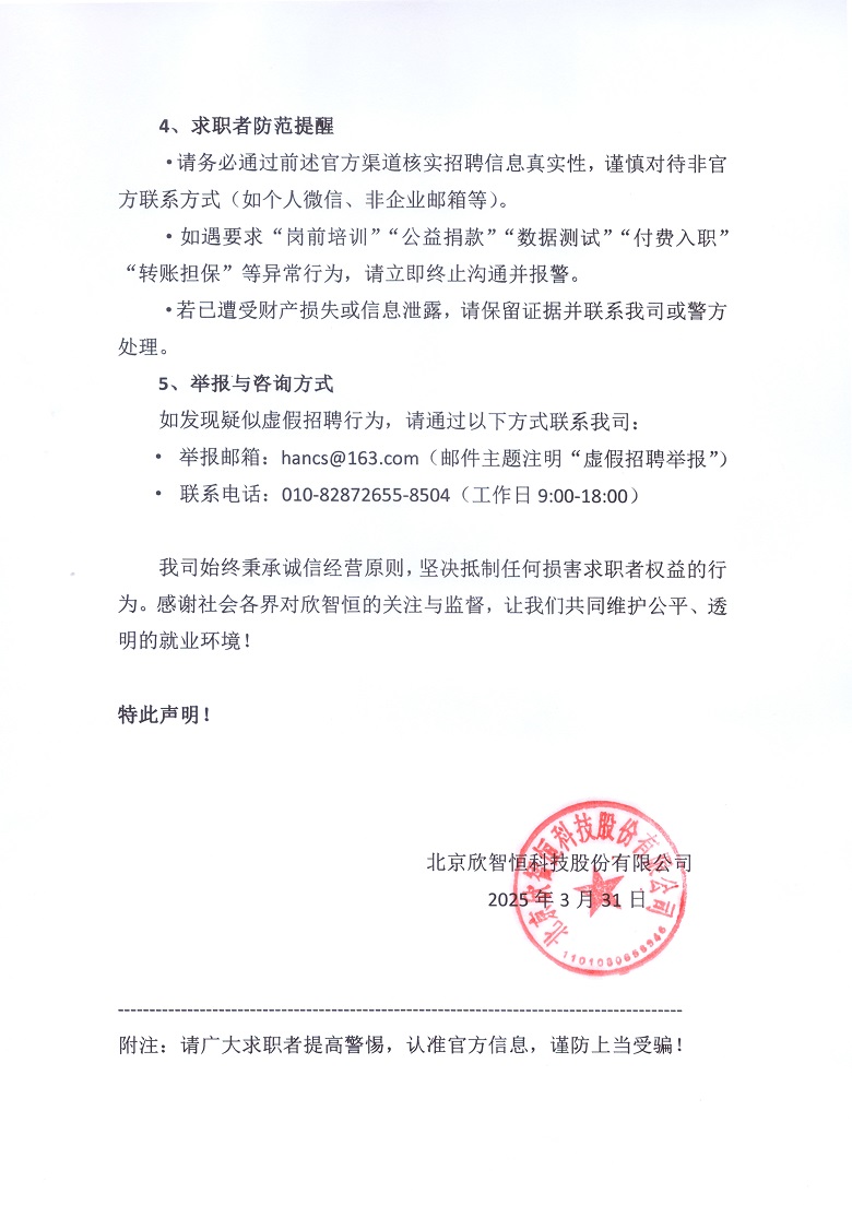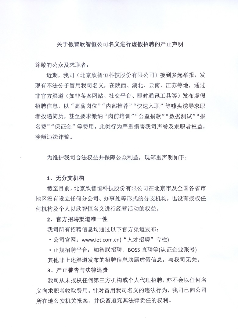 關(guān)于假冒欣智恒公司名義進(jìn)行虛假招聘的嚴(yán)正聲明