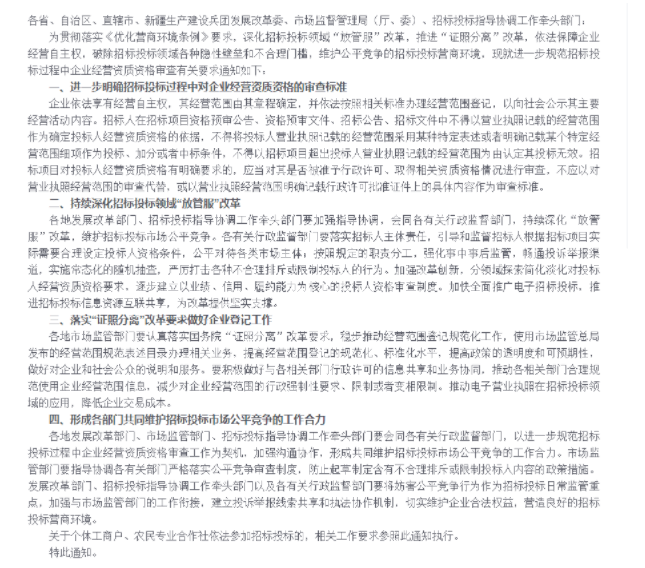 以前招標方以營業(yè)執(zhí)照記載的經(jīng)營范圍為理由排斥其他投標人,可能還屬于打了擦邊球,被排斥的投標人有口也說不出啥。而此次發(fā)改委的政策通知一出,就相當于官宣了,以后招標方就不能再這樣操作了?。。?/strong>