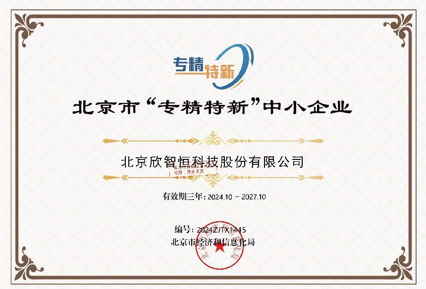 欣智恒科技成功入圍北京市“專精特新”中小企業(yè),這是繼國(guó)家高新技術(shù)企業(yè)、中關(guān)村高新技術(shù)企業(yè)、中關(guān)村瞪羚企業(yè)、海淀海帆企業(yè)之后,欣智恒科技獲得的又一項(xiàng)重要資質(zhì)與能力水平認(rèn)定。欣智恒科技表示:公司入選為專精特新企業(yè),是對(duì)公司創(chuàng)新能力、研發(fā)能力、專業(yè)化程度等綜合發(fā)展實(shí)力的充分認(rèn)可, 有利于不斷提升公司核心競(jìng)爭(zhēng)力,進(jìn)一步增強(qiáng)公司品牌知名度和行業(yè)影響力,并推動(dòng)公司健康、可持續(xù)發(fā)展。